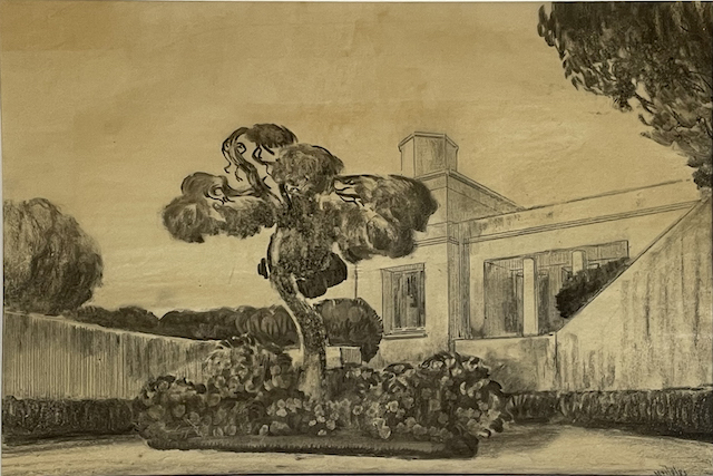 À partir de 1918, les sujets antiques, Acropole, colonnes, temples en ruines, reviennent dans ses dessins, souvent ornés de végétation et sublimés par des éléments naturels. Les projets de villas, comme celle du Docteur Gros, révèlent son répertoire imaginaire : une architecture classique : arches, colonnes, cours intérieures contrastant avec une végétation foisonnante. Les arbres, cyprès et plantes suspendues deviennent l’ornement par excellence et le motif privilégié de son oeuvre libre, annonçant déjà une modernité dans sa conception du paysage urbain. Tony Garnier développe ses idées nouvelles sous forme d’images plutôt que de mots, explorant des territoires imaginaires qui renouvellent le rapport entre le bâti et le végétal...